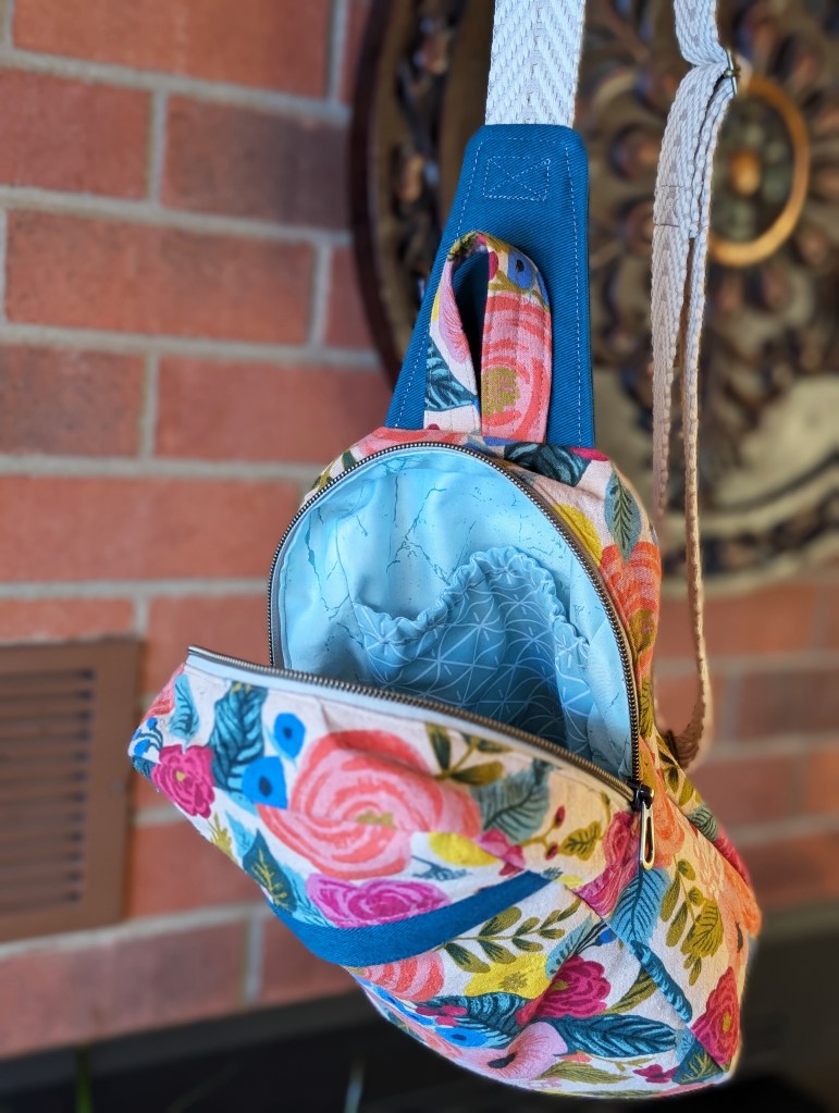 The exterior of this bag is an upcycled cozy sweater and the interior is quilting cotton from the Tula Pink Linework fabric line. The strap and also Tula Pink. It has a front zipper pocket and a secondary interior pocket. The strap can be clipped on the bottom left or the bottom right of the bag so it’s perfect for left-handed or right-handed people!